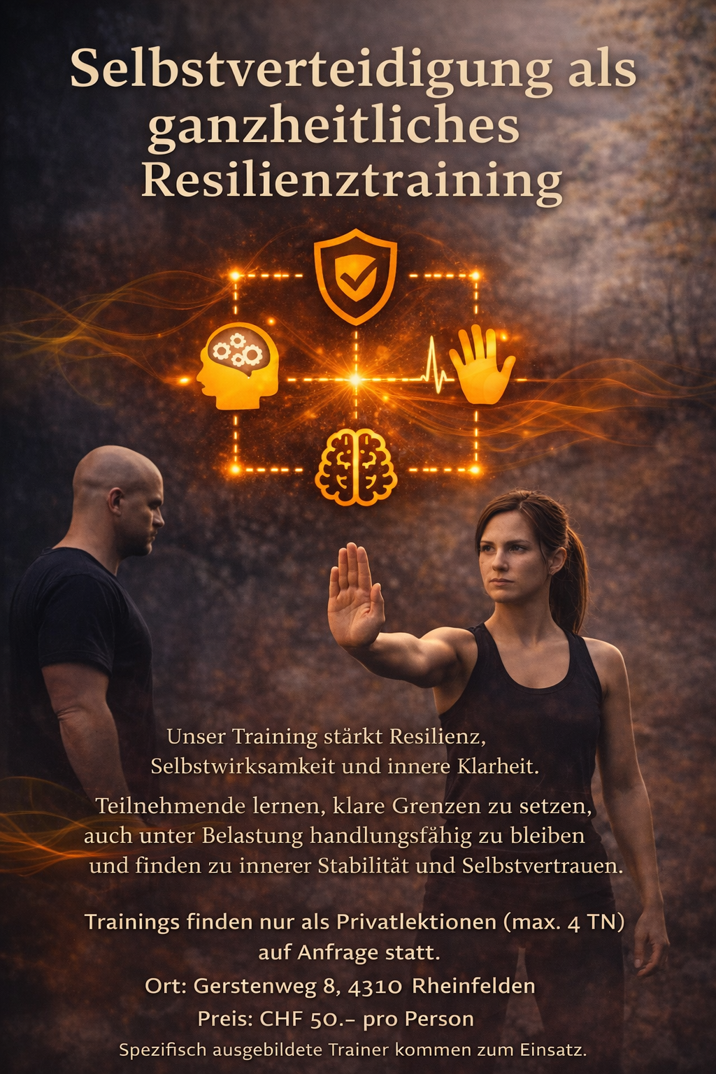 • Im Mittelpunkt stehen körperlich erlebbare Erfahrungen: stabiler Stand, bewusste Atmung, klare Grenzsetzung und der Umgang mit Stress. Teilnehmende lernen, ihre eigenen Grenzen wahrzunehmen, ein klares Nein zu setzen und auch unter Belastung handlungsfähig zu bleiben.