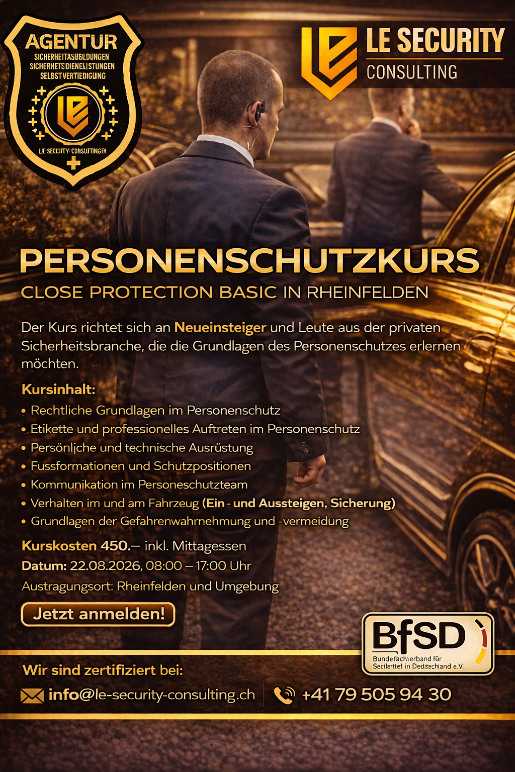 Der professionelle Personenschutz umfasst ein klares System, welches wie ZahnrĂ€der einer Maschine ineinandergreift. In diesem Modul erlernen Sie die jeweiligen Sektorenzuteilungen, sowie Positionen und Aufgaben im Begleit- und Nahschutz kennen. Weiter werden Ihnen das Verhalten im und um ein Fahrzeug inkl. den Dispoformationen beigebracht. Theoretisch beinhaltet die Ausbildung Einblicke in die Aufgaben eines Observationsteams, des Vordetachements sowie die Rechtsgrundlagen des privaten Personenschutzes. On the job werden wichtige Hinweise zu Knigge und Verhaltensanweisungen im VIP Umfeld anlĂ€sslich einer Ăbung aufgezeigt.